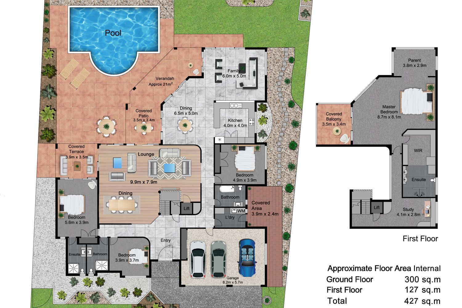 · 4 massive bedrooms with 4 bathrooms, a 3 car garage & office