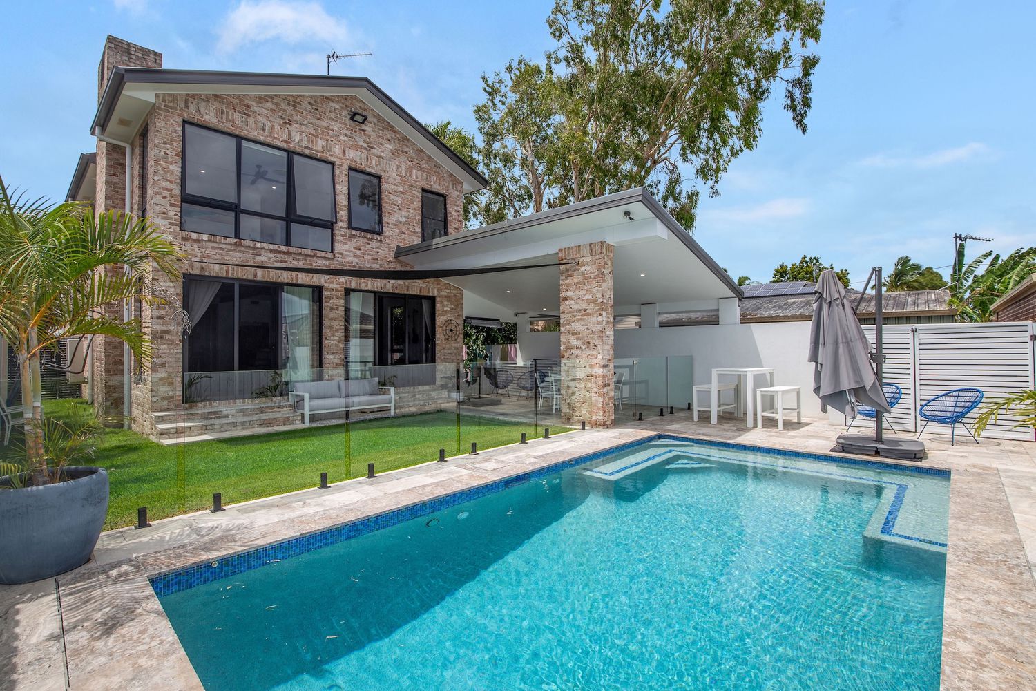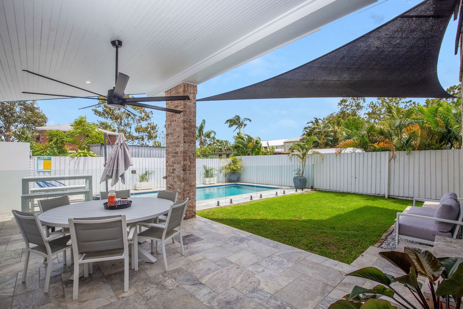 • Sparkling heated saltwater pool with quality travertine surrounds & lighting
