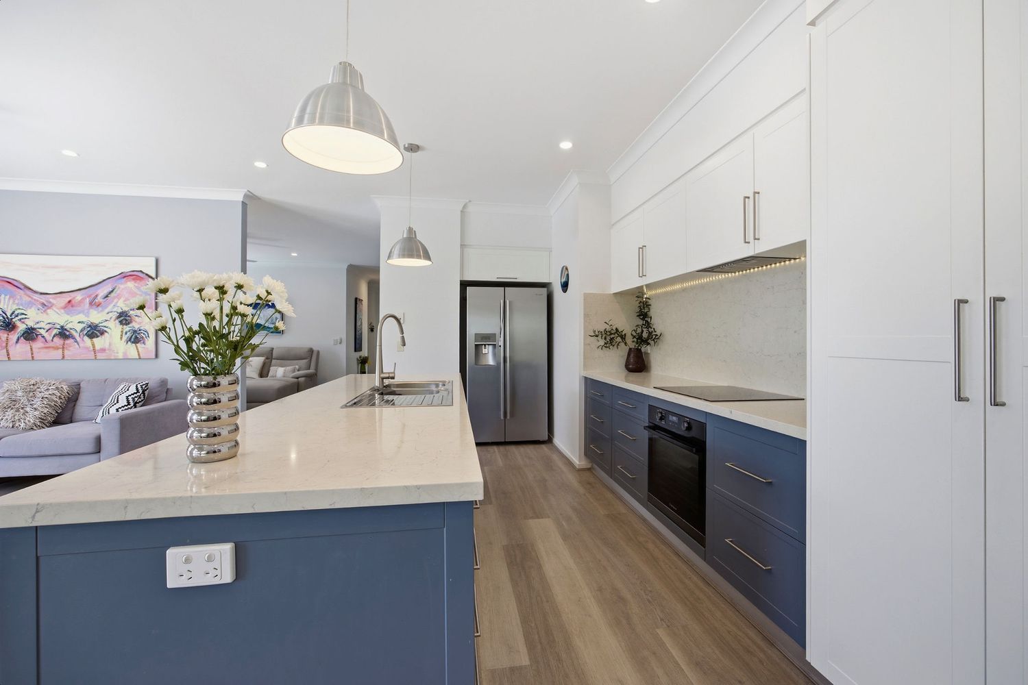 Stylish SHOWCASE 2 pac kitchen offers 40 mm stone tops, Miele dishwasher, Westinghouse self-cleaning Pyrolytic/air fryer oven, Induction cook top, 1 mt Wide plumbed fridge space, tiled splashback, Sinkerator & soft closing doors