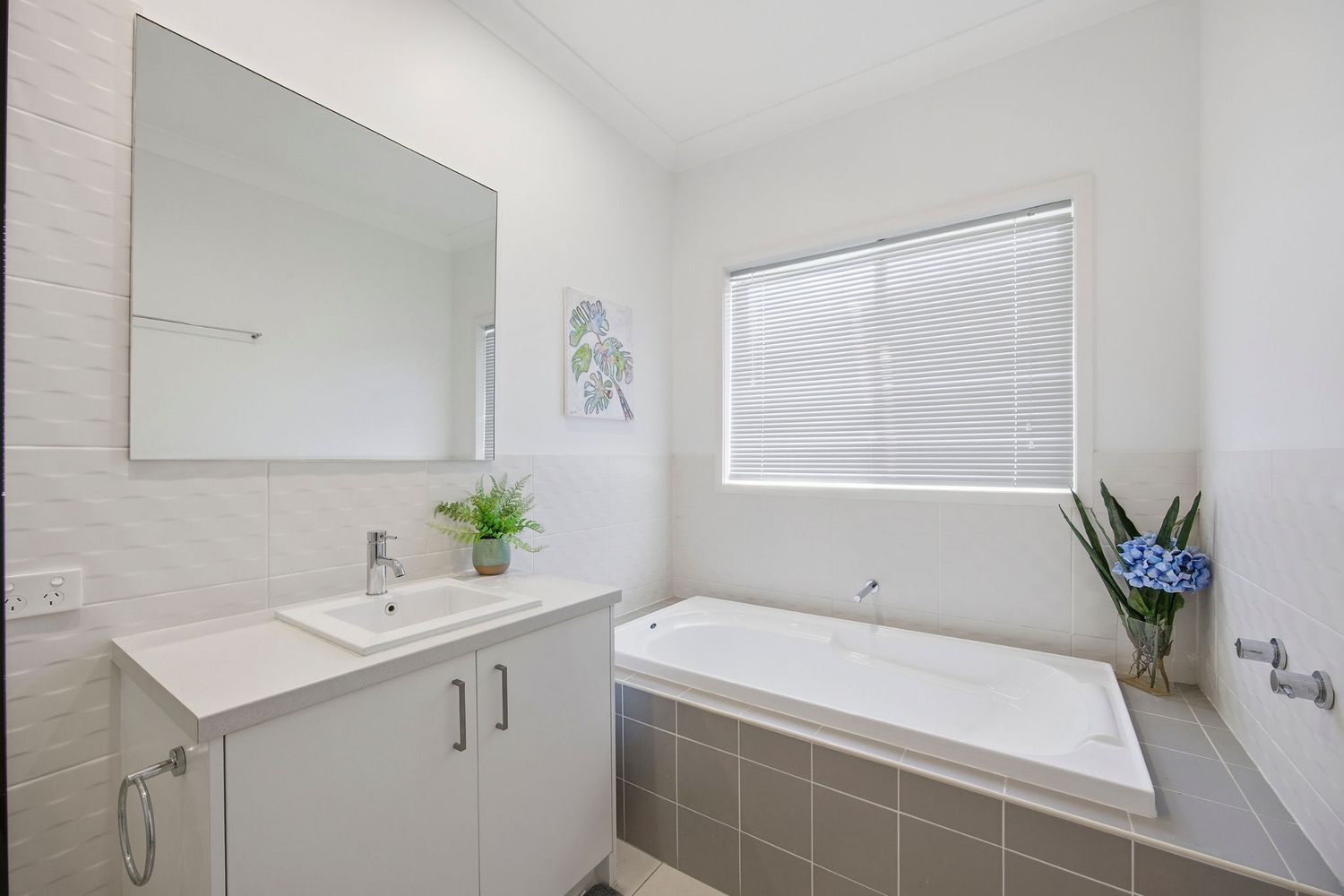 Main bathroom has wave effect tiles & a separate shower & bath